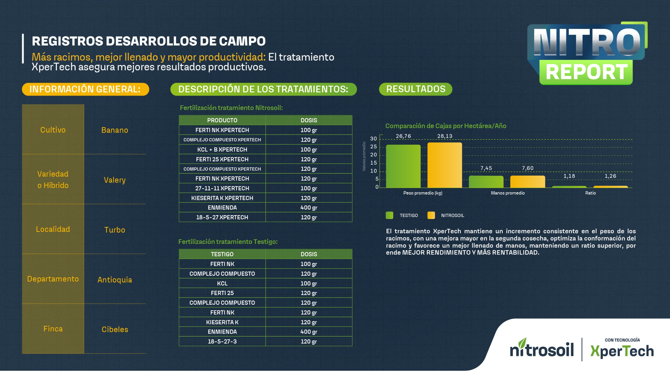 Registros de desarrollo de campo realizados en Turbo, Antioquia, específicamente en banano variedad Valery, confirman que el uso de Nitrosoil con tecnología XperTech rompe ese techo productivo. Los resultados frente al manejo testigo son contundentes: